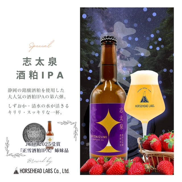 【ご注意】 ・こちらはタンク中層以上の上澄み部分を充填した通常版です。 ・本製品はスタイルの特性上、一切の濾過を行わないノンフィルタード製品ですので、酒粕や果実、ホップ由来の固形物が多く含まれます。予めご了承ください。 ▼ブランド HORSEHEAD LABS ▼品目 発泡酒 ▼スタイル 酒粕IPA ▼原材料 麦芽、酒粕、オーツ麦、苺果汁、乳糖、ホップ、酵母、カラギナン ※カラギナンは海藻から抽出される天然由来の多糖類です。 ※ゼラチンなどの動物性原料は使用していません。 ▼容量 330ml / 1本 ▼アルコール度数(ABV) 6.0% ※システム上、本ページに「別途送料がかかります」との表記がありますが、北海道・沖縄地域のみ遠方料金が発生いたします。 [醸造ノート] 静岡の銘醸酒粕を使用した大人気の酒粕IPAシリーズ。 今回は全て『志太泉 純米大吟醸』の酒粕を使用した超贅沢な仕上がりです。 静岡県藤枝市の志太地区は今でも美しい里山が保全され、美しい瀬戸川の流れのそばで志太泉は造られます。 地下からくみ上げられる清らかな仕込水を口に含むと、その酒の柔らかな酒質を体現するような素晴らしいものでした。 今回の酒粕IPAもその柔らかさを受け継ぎ、また非常にハーバルな高貴なアロマに満ちた渾身の一杯に仕上がりました。 [志太泉酒造公式サイト] https://shidaizumi.com/ ※本品は酒税法上「発泡酒」に分類されます。